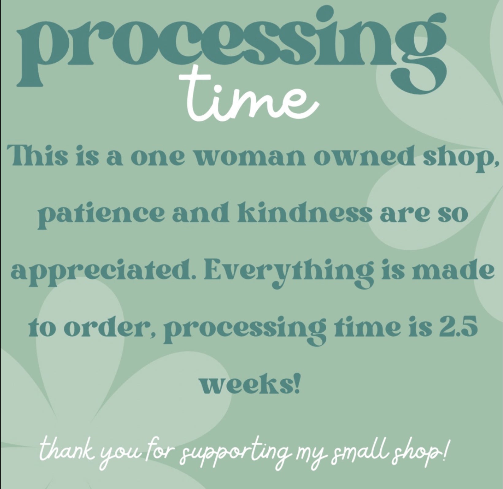 Everything is made to order! Processing time is about 2.5 weeks.